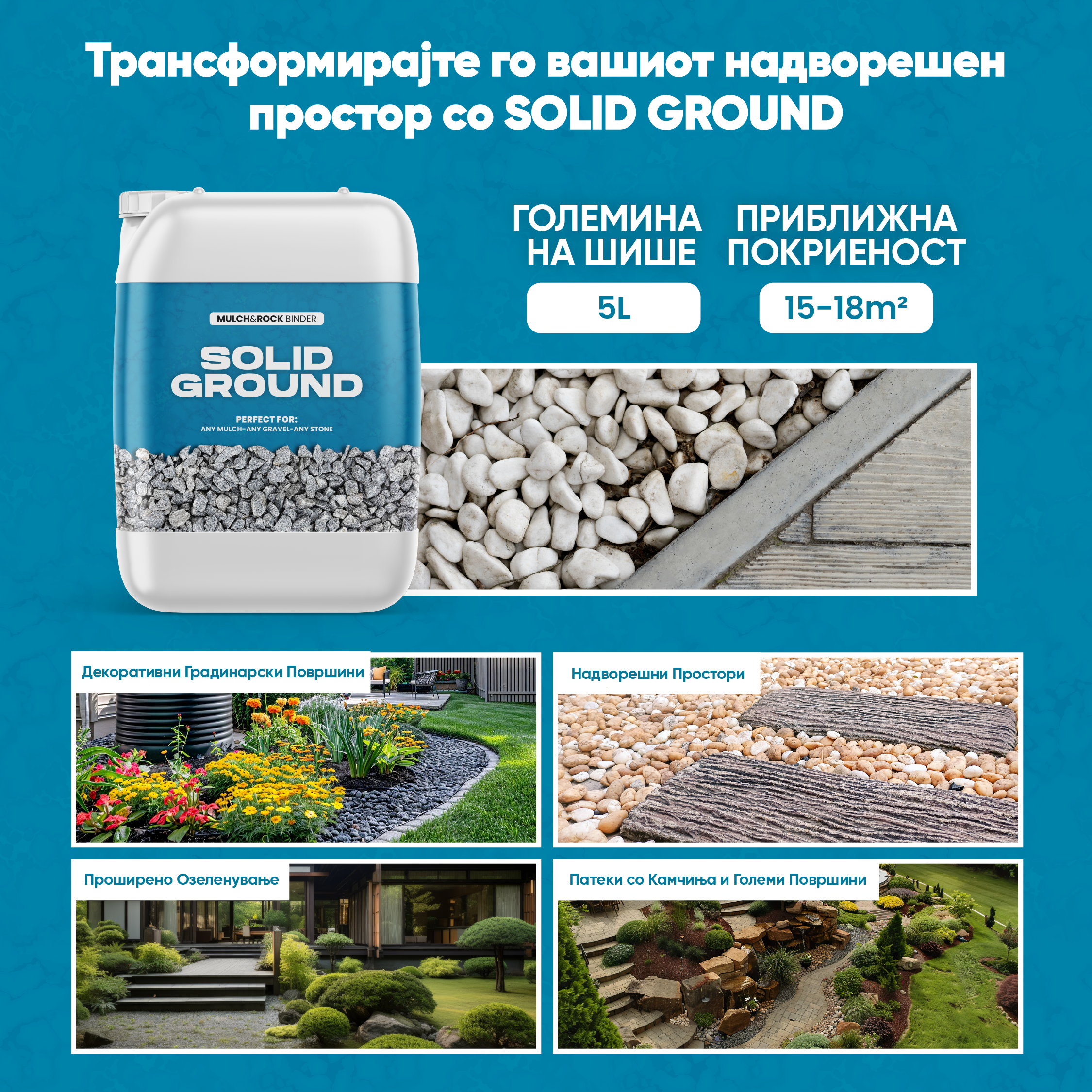 Solid Ground е природно и еколошко средство што ги стабилизира декоративните камчиња и мулчот, создавајќи уредна површина без кал и без блокирање на водата.