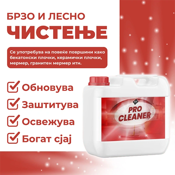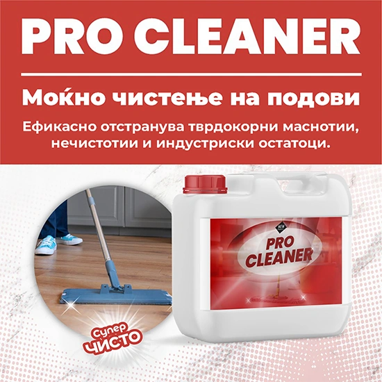 Pro Cleaner е средство за длабинско и долготрајно чистење кое ефикасно ги отстранува нечистотиите, тврдокорните дамки, мувлата и наслагите од сите видови на површини.