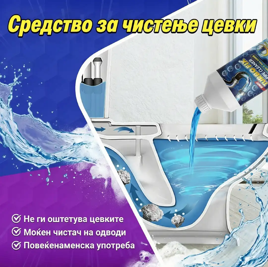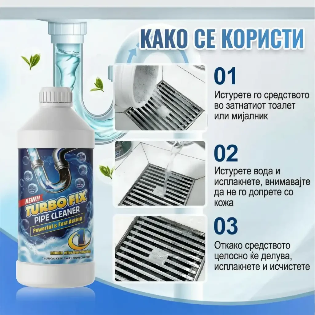 Turbo Fix е моќно средство за одзатнување на одводи кое нуди брзо и ефикасно решение за проблемите со затнати мијалници, тушеви и одводи во кујна и бања.
