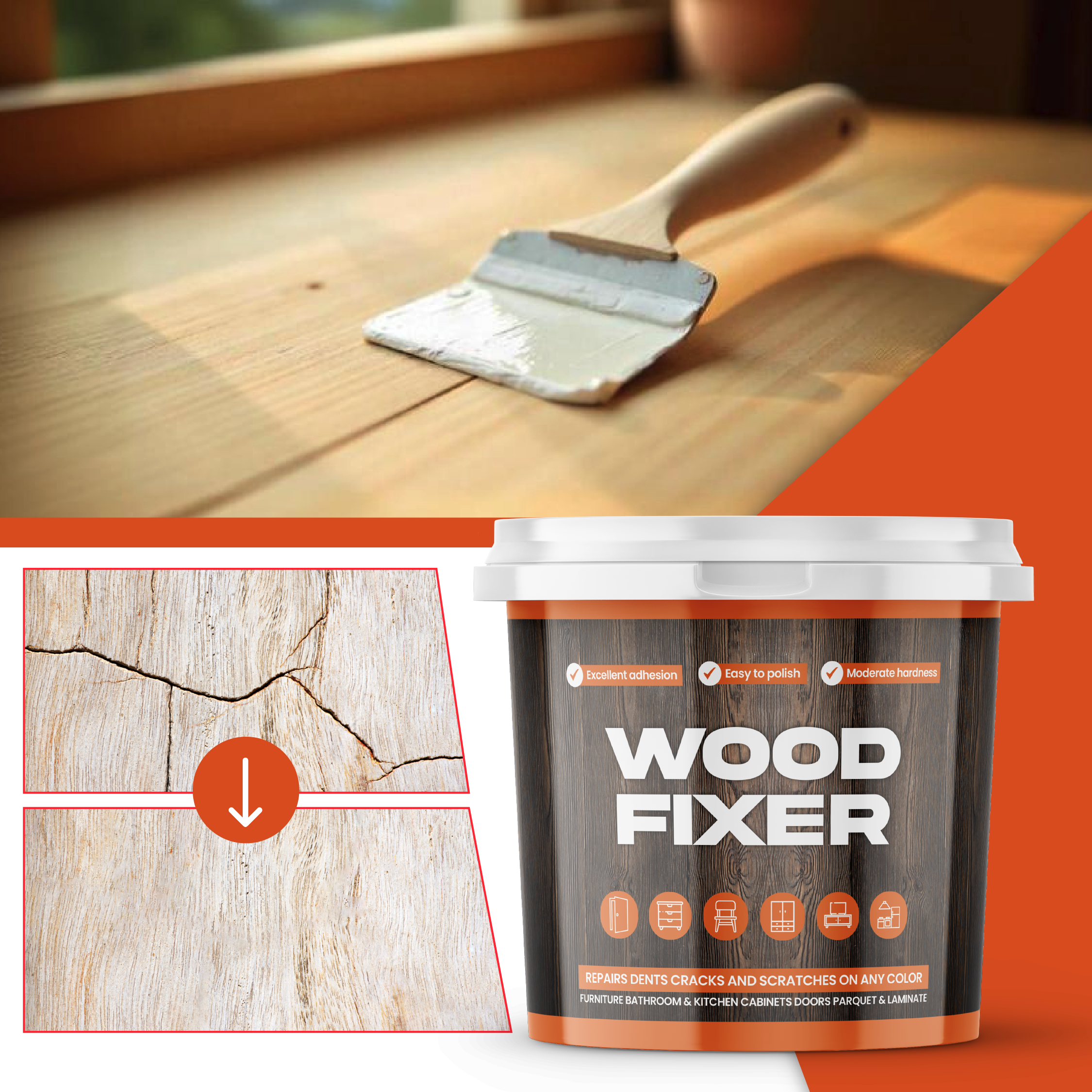 Без разлика дали станува збор за мебел, врати, прозорци, подови или антички предмети од дрво – Wood Fixer е едноставно решение за брза и ефикасна поправка.